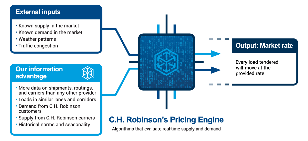 The seamless connection between our system and yours includes real-time rates and the ability to tender freight. Our algorithmic-based dynamic pricing engine pulls data from our network of more than 200,000 shippers and carriers—delivering more data on real-time supply and demand, routes, and shipments than any other provider.