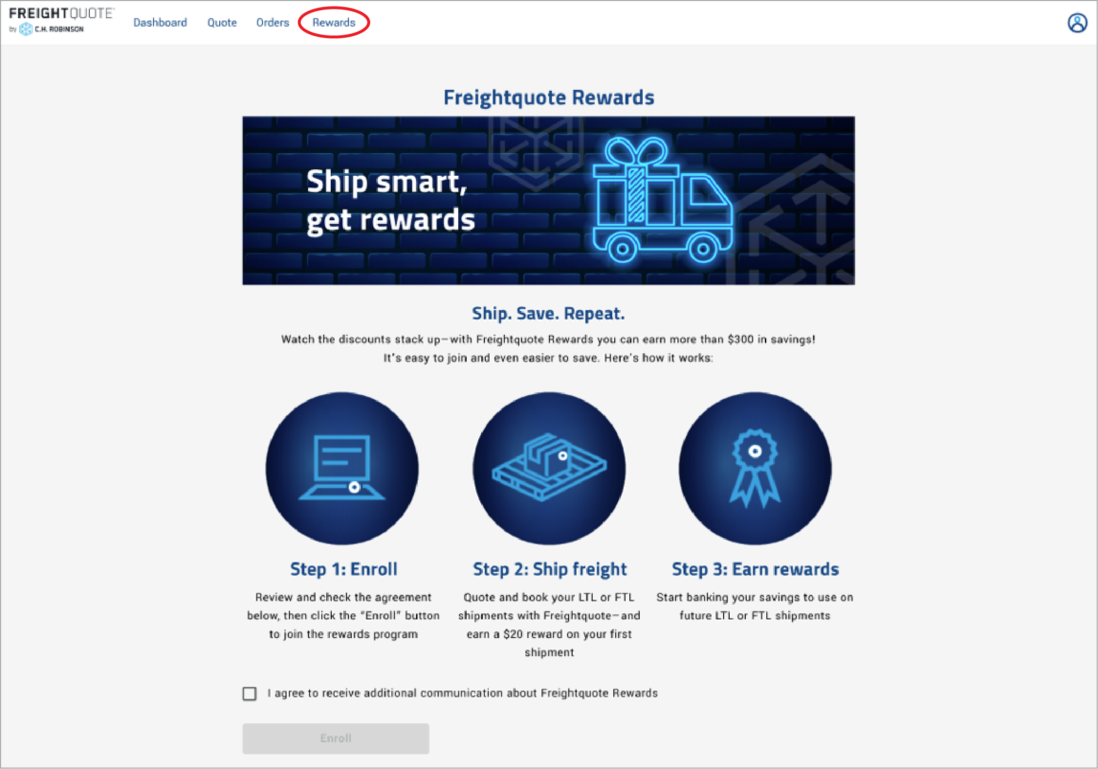 Freightquote Rewards is free and open to all Freightquote by C.H. Robinson customers. All you have to do is create a Freightquote account, or sign in to your account, and join right from your dashboard.